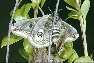 | Насекомые — Insecta, Чешуекрылые — Lepidoptera | Павлиний глаз ночной малый, Eudia pavonia | 3 | Включен в Красную книгу МСОП. | Организация ООПТ на верховом болоте Целау. Выявление новых мест обитания и мониторинг численности вида. Регламентация хозяйственной деятельности, связанной с болотными экосистемами и изменением гидрологического режима земель (добыча торфа, мелиоративные работы и т. п.). | ![]() |