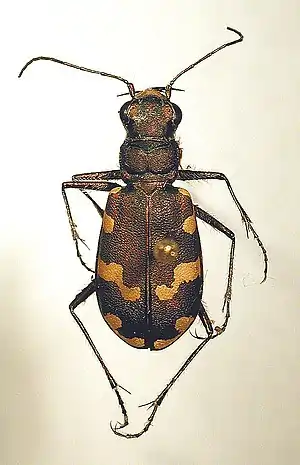 | Насекомые — Insecta, Жесткокрылые — Coleoptera | Скакун приморский, Cicindela maritima | 2 | Как часть биоты охраняется на территории национального парка «Куршская коса». | Улучшение охраны мест обитания вида на территории НП «Куршская коса». Отказ от обработки лесных и прилегающих к ним биотопов инсектицидами в целях борьбы с насекомыми-вредителями леса и иксодовыми клещами. Создание ООПТ на Балтийской (Вислинской) косе. | ![]() |