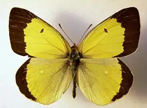 | Насекомые — Insecta, Чешуекрылые — Lepidoptera | Желтушка торфяниковая, Colias palaeno | 3 | Не принимались. | Организация ООПТ в местах обитания вида (в первую очередь на территориях верховых болот Целау и Большое Моховое). Выявление новых мест обитания и мониторинг численности вида. Регламентация хозяйственной деятельности, воздействующей на болотные экосистемы и гидрологический режим земель (добыча торфа, мелиоративные работы и т. п.). | ![]() |