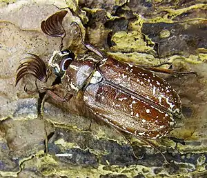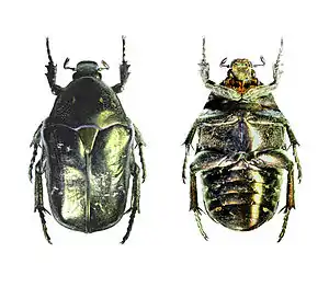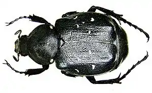 | Насекомые — Insecta, Жесткокрылые — Coleoptera | Лунный копр, Copris lunaris | 3 | Не принимались. | Сохранение пастбищ для выпаса скота, стимулирование развития малых фермерских хозяйств, создающих мозаику экологических ниш для множества насекомых и поддерживающих луговые сообщества на определенной стадии сукцессии. Выявление новых мест обитания и мониторинг численности вида. | ![]() |