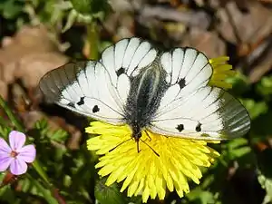 | Насекомые — Insecta, Чешуекрылые — Lepidoptera | Аполлон обыкновенный, Parnassius apollo | 1 | Включен в Красные книги МСОП, России и Приложение II к Конвенции СИТЕС. | Выявление мест обитания в Калининградской области и создание ООПТ в населенных видом биотопах. Снижение интенсивности выпаса скота в биотопах, пригодных для обитания вида, строгая регламентация применения инсектицидов, частичное осветление леса путём избирательных рубок в осеннее и зимнее время в местах обитания вида. | ![]() |