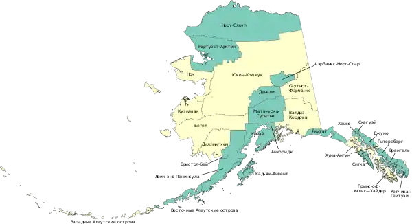 | Кенай Kenai Peninsula Borough | 122 | боро | 1964 | Солдотна | 58 506 | 64 108 | 22 473 | 41 635 | 1,41 | ![]() |