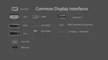 Порты распространённых стандартов для подключения дисплеев, в масштабе. Показаны различные варианты портов в стандартах VGA, DVI, HDMI, DisplayPort, Thunderbolt, USB Type-C.