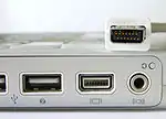 ![]() Штекер/папа Mini-DVI лежит на 12 -дюймовом Power Book G4, гнездо/мама в нём второе слева. |