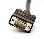 VGA connector (обобщённо называют DE-15) | Стал повсеместным видеоконнектором с момента появления в IBM x86 машинах. Более старые VGA разъёмы DE-9 (9-pin). Современный DE-15 разъём может нести VESA Display Data Channel для обмена информацией между видеокартой и монитором[4] | |