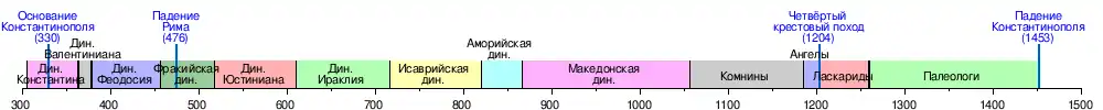 Первым императором Рима стал Октавиан Август 13 января 27 года до н. э.[1] В 395 году империя была окончательно поделена на Западную Римскую империю и Восточную Римскую империю[2]. В 476 году был свергнут последний Западно-римский император Ромул Август. Западная Римская империя пала, а Восточная Римская империя, которая позже стала называться историками Византией, продолжала существовать ещё около тысячи лет, до 1453 года, когда Константинополь был захвачен турками-османами[3], с перерывом с 1204 по 1261 год, когда Константинополь был захвачен крестоносцами[4]. Выделение восточных областей Римской империи в самостоятельное государство началось в период «тетра́рхии» (греч. τετραρχία — «правление четырёх»), системы управления, введённой императором Диоклетианом в 293 году и продолжавшейся до 313 года. В 285 году Диоклетиан назначил военачальника Максимиана младшим соправителем («цезарем»), а в 286 году — «августом», при этом Диоклетиан управлял восточной половиной империи, а Максимиан — западной. В 293 году посчитав, что военные и гражданские проблемы требуют специализации, дополнительно были назначены двое цезарей в помощники августам: Галерий и Констанций Хлор. Предполагалось, что августы будут отрекаться после 20-летнего правления, а власть будет переходить к цезарям. Четырьмя столицами тетрархов были: