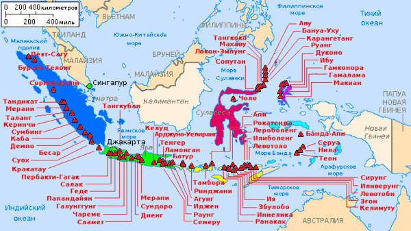 Зелёная область — вулканы Зондского пролива и Явы