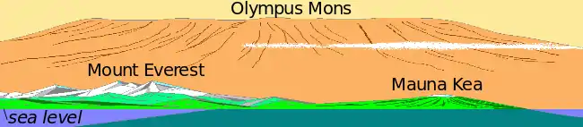 | Марс | Олимп | 21,2[1] | 26[2] | вулканическое | Возвышается на 26 км над равнинами в 1000 км к северу от пика. |