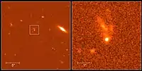z = 0.695 | BeppoSAX | Первое рентгеновское послесвечение. Первое оптическое послесвечение. Определение красного смещения позволило сделать вывод о внегалактическом происхождении гамма-всплесков.[4] | ![]() | ||