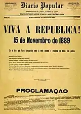 Первая Бразильская республика была установлена 15 ноября 1889 года в результате военно-политического переворота, организованного маршалом Деодору да Фонсекой, провозгласившим Республику Соединённых Штатов Бразилии (порт. República dos Estados Unidos do Brasil)[4] на поле Сантана в Рио-де-Жанейро (где в 1822 году прошла инаугурация первого императора)[18] и ставшим главой временного правительства[47]. Начавшаяся сразу разработка республиканской конституции завершилась её утверждением 24 февраля 1891 года[60]. На прошедших на следующий день в Национальном конгрессе президентских выборах Фонсека победил как независимый кандидат, однако в том же году был вынужден подать в отставку и передать полномочия вице-президенту Флориану Пейшоту.