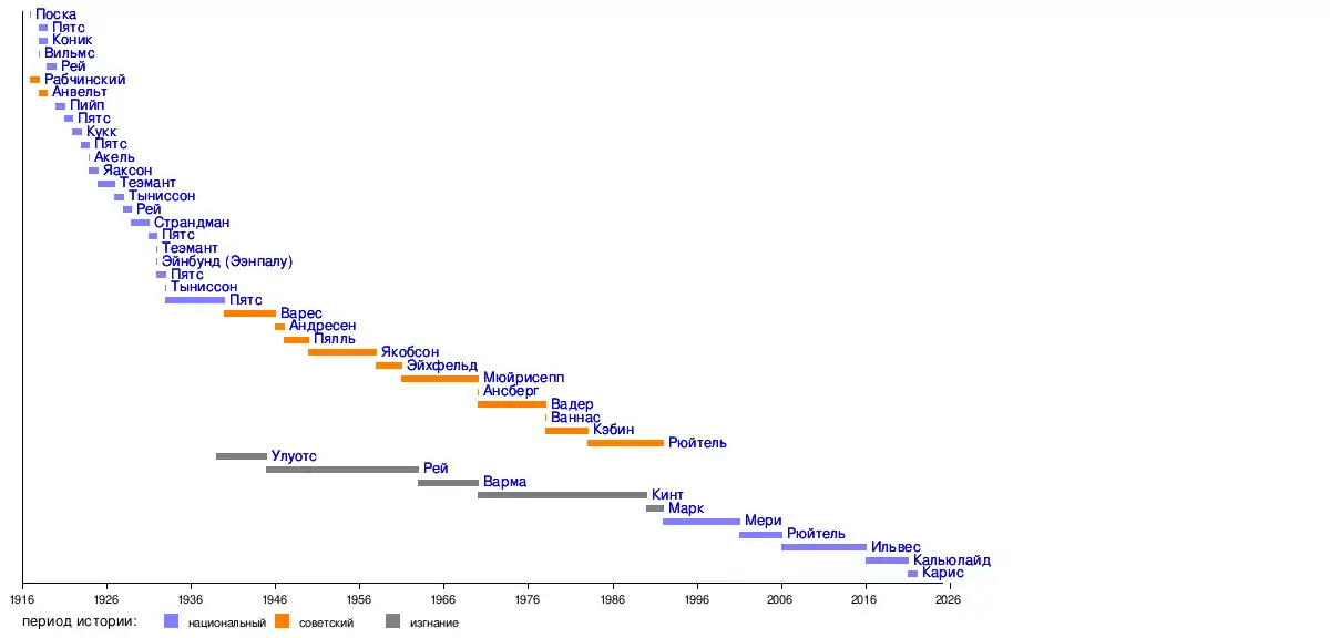 | 11 | 25 августа 1940 | 29 ноября 1946[комм. 20] | Председатель Президиума Верховного Совета Эстонской ССР эст. Eesti NSV Ülemnõukogu Presiidiumi esimees | ||||