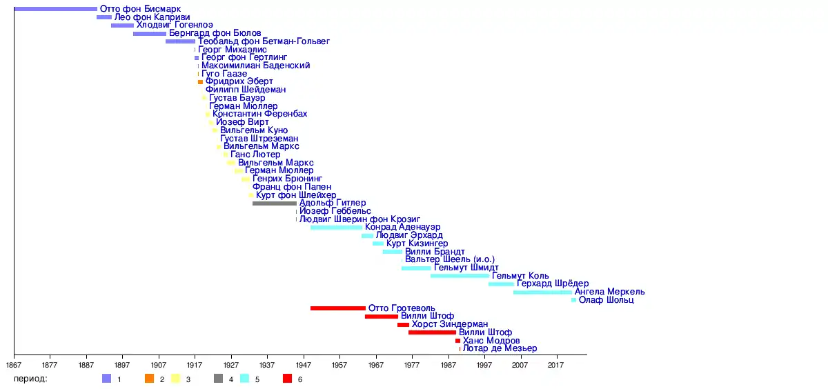 - Легенда диаграммы: 1 — Период монархии; 2 — Революционный период; 3 — Веймарская республика; 4 — Третий Рейх; 5 — ФРГ; 6 — ГДР