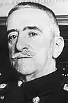 После победы Народного фронта на состоявшихся в феврале выборах[218] выступавшие за усиление национального государства военные 17—18 июля 1836 года совершили путч[220], который послужил началом гражданской войны[221][222], приведшей к падению Второй республики и установлению франкизма[223]. 25 июля 1936 года поддержавшими восстание высшими офицерами в Бургосе была создана Хунта национальной обороны Испании (исп. Junta de Defensa Nacional de España), принявшая на себя «все полномочия государства» на контролируемой ими территории[265]. Она строилась на основе военной иерархии, где старшим по возрасту и служебному стажу дивизионным генералом являлся Мигель Кабанельяс, ставший её президентом (исп. Presidente de la Junta de Defensa Nacional de España). На следующий день Франсиско Франко был назначен командующим повстанцев на южном фронте, 3 августа 1936 года введён в состав хунты, а 21 сентября резолюцией членов хунты назначен главой правительства государства и генералиссимусом национальных сухопутных, морских и воздушных сил (исп. Jefe del Gobierno del Estado y Generalísimo de las fuerzas nacionales de tierra, mar y aire)[266]. Являясь главнокомандующим операции по перемещению армии из Марокко на Иберийский полуостров, Франко был сильнейшим претендентом на единое командование; 30 сентября ему было присвоено звание генералиссимуса, а 1 октября 1936 года на военном параде в Бургосе он был провозглашён главой государства (исп. Jefe del Estado)[267]. На первом этапе были созданы несколько органов управления зоной восстания (исп. zona sublevada, или национальная зона, исп. zona nacional), наиболее близкими к правительственным были функции Технического совета государства (исп. Junta Técnica del Estado), учреждённого 3 октября 1936 года[268].