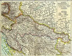 Королевство Хорватия и Славония (сербохорв. Kraljevina Hrvatska i Slavonija, венг. Horvát-Szlavón Királyság, нем. Königreich Kroatien und Slawonien) было номинально автономным королевством в составе Австро-Венгерской империи. Оно было создано хорватско-венгерским соглашением (хорв. Hrvatsko-ugarska nagodba), утверждённым императором Францем Иосифом 12 ноября 1868 года, определившим положение Хорватии и Славонии в составе Земель короны Святого Иштвана (Транслейтании). Объединило в себе Королевство Хорватию и Королевство Славонию, с последующим включением 8 января 1881 года сопряжённых с ними земель Военной границы[4]. Официальным названием королевства было Королевство Хорватии, Славонии и Далмации (сербохорв. Kraljevina Hrvatsku, Dalmaciju i Slavoniju, лат. Regnum Croatiae, Dalmatiae et Slavoniae), что связано со спорностью отнесения Королевства Далмации (традиционно считавшегося принадлежащим короне Святого Иштвана) в состав Цислейтании; в историографии за ним закрепилось название Триединое королевство (сербохорв. Trojedna kraljevina)[5]. Официальным языком был признан хорватский, однако ещё в 1850 году крупнейшими сербскими и хорватскими учёными было подписано «Венское литературное соглашение» — первый из двух договоров о единстве сербскохорватского языка[6].