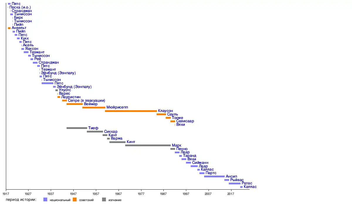 Курсивом на сером фоне показаны даты начала и окончания полномочий Яана Поски, замещавшего Константина Пятса до его возвращения из германского лагеря для военнопленных.