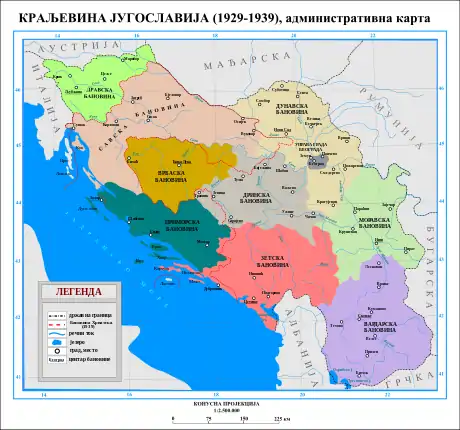 3 октября 1929 года король Александр обнародовал вступивший на следующий день в силу закон «О наименовании и разделении королевства на административные районы», по которому страна стала называться Королевство Югославия (сербохорв. Краљевина Југославија / Kraljevina Jugoslavija, словен. Kraljevina Jugoslavija)[1] и была разделена на бановины со смешанным национальным составом[30].
