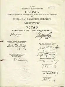 Новая конституция, известная как «сентябрьская конституция» (серб. Септембарски устав), была октроирована королём 3 сентября 1931 года, положив конец установленному им 6 января 1929 года режиму военно-монархической диктатуры. Формально её действие было прекращено только с провозглашением Федеративной Народной Республики Югославии 29 ноября 1945 года[31][32]. Однако на прошедших 8 ноября 1931 года выборах из-за требований к сбору подписей для регистрации был выставлен только правительственный список; избранные по нему депутаты 4 мая 1932 года образовали единственную разрешённую партию — Югославскую радикально-крестьянскую демократию (20 июля 1933 года переименована в Югославскую национальную партию)[33].