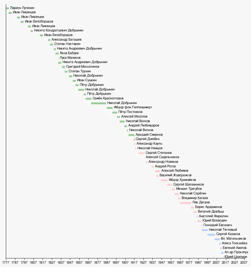 - Отсутствует информация о персоналиях в следующие периоды: 1783—1789, 1796—1801, 1806—1814, 1817—1823, 1844—1846, 1919—1922, 1931—1936, 1938—1940