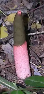 Мутинус собачий | Mutinus caninus (Huds.) Fr., 1849 | Плодовые тела округлые, вытянутые, 2—3 см длиной. Оболочка белого цвета, делящийся в вершине на 2—3 лопасти. Спороносный столбик длиной до 12 см высотой, розового цвета. Споры бесцветные. В Амурской области обитает Зейском, Селемджинском, Свободненском районах, окрестностях Благовещенска. |