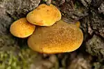 Трутовик лакированный | Ganoderma lucidum (Curtis) P.Karst., 1881 | Сапрофит. Плодовые тела однолетние, полукруглой или почковидной формы, до 15 см диаметром. Ножка длиной 5—25 см. Ткань кремово-белая или тёмно-пурпурно-бурая, зональная. Трубчатый слой пурпурно-бурый. Споры коричневого цвета.