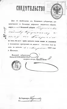 - Принадлежность к дворянству доказывалась в губернском дворянском собрании; с 1785 г., то есть со времени издания Императрицей Екатериной II «Жалованной грамоты дворянству», лица, признанные в дворянском достоинстве по происхождению или по личным заслугам, вносились в губернскую родословную книгу; из губернии дела о дворянстве поступали на утверждение в Герольдию Сената; туда же из губернских собраний ежегодно высылались списки лиц, причисленных к уже утвержденным в дворянстве родам. Происхождение из дворян определенной губернии фиксировалось и в послужных списках чиновников и военных, хотя часто указывалась не губерния, по которой числился их род, а губерния, в которой родились они сами[18].