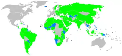 Карта дипломатических представительств Государства Палестина в мире. Дипломатические представительства обозначены (светло-зеленым), представительства не резиденты (голубым)