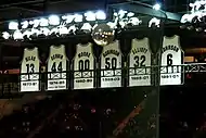 Клубы Национальной баскетбольной ассоциации в знак признания заслуг игроков или тренеров закрепляют за ними номера. В случае закрепления номера, его больше не используют в данной команде. Закреплённые номера обычно вывешиваются под потолком домашней арены команды. Некоторые клубы посвящают игровой номер своим болельщикам, дикторам или другим людям, внесшим большой вклад в развитие команды. Кроме номеров на флагах изображают количество побед (для тренеров), микрофоны (для дикторов), занимаемую должность, достижения, имена или просто инициалы[1].