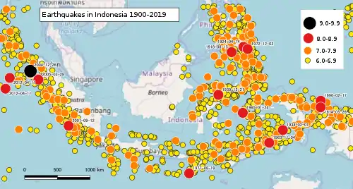 Это неполный список недавних зарегистрированных крупных землетрясений, которые произошли в пределах Индонезии — на что указывает геология региона и вулканическая активность — очень большое количество землетрясений меньшей магнитуды происходит очень регулярно из-за встречи основных тектонических плит в регионе. По данным Геологической службы США, в период с 1901 по 2017 год в Индонезии произошло более 150 землетрясений магнитудой > 7.