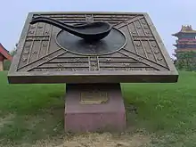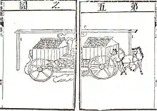 - Колесница, указывающая на юг: Хотя утверждение государственного деятеля царства Вэй Ма Цзюня (ок. 220—265) о том, что колесница, указывающая на юг, впервые была изобретена Жёлтым Императором, вызывает сомнение, колесница самого Ма Цзюня была успешно разработана и проверена в 225 г. н. э., а в последующие эпохи многократно воссоздана. Это устройство представляло собой колёсную повозку с дифференциальной передачей, которая обеспечивала установленной наверху деревянной фигурке постоянную ориентацию, при которой она всегда указывала вытянутой рукой в южном направлении независимо от движения повозки. По существу это был немагнитный компас.[165] Книга песен, написанная в VI веке, отмечает, что устройство было успешно переизобретено в эпоху династии Лю Сун (420—479) китайским математиком и астрономом Цзу Чунчжи (429—500).[166] Японский исторический текст Нихон сёки, написанный в 720 г., отмечает, что такие колесницы были дважды поднесены в дар японскому императору Тэндзи (661—672) китайскими буддистскими монахами Чжи Юйем и Чжи Юем по двум различным поводам в 658 и 666 годах.[167] Устройство колёсной повозки было описано в мельчайших деталях в историческом тексте 1345 г. в эпоху империя Сун (960—1279). К примеру, там указано число зубьев в каждой шестерне зубчатой передачи, диаметр каждой шестерёнки и её правильное положение в механизме.
