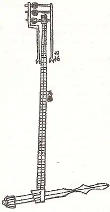 - Двухструйный огнемёт: Хотя одноструйный огнемёт был впервые разработан в Византии в VII веке,[95] китайский огнемёт или «ручка Хо Ци» X века отличался от него непрерывным потоком пламени с применением двухпоршневого шприца (который был известен со времён династии Хань). Огнемёт извергал фонтан греческого огня, импортировавшегося благодаря морским торговым контактам Китая с Ближним Востоком. Его первое описание восходит к 917 г., а первое использование в бою датируется 932 г., эпохой пяти династий и десяти царств (907—960). Первая его иллюстрация найдена в военном манускрипте 1044 г. Уцзин Цзуняо начала династии Сун (960—1279), в котором также описано подробное устройство этого оружия. В отличие от греческой модели, которая использовала топку, «ручка Хо Ци» воспламенялась от порохового зажигательного запала.[96][97]