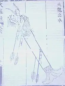 - Многоступенчатая ракета: До сих пор существует некоторая неопределённость относительно того, где появились первые ракеты. Это могло быть в Европе в XIII веке, о чём около 1232 г. написал Марк Грек в книге под названием «Крылатый огонь с небес», хотя Нидэм и Дэвис утверждают, что вероятнее всего это была не ракета, а «огненное копьё». Это могло быть на Ближнем Востоке в 1280 г., о чём написал Хасан аль-Раммах в книге «sahm al-Khitāi» или «Стрелки Китая». Наконец, это могло быть в Китае в 1264 г., когда было записано о применении «ди лао шу» или «земляных крыс», либо в 1270 г., когда упомянуто о применении «чонг» или «мортиры», которую использовала армия династии Сун против вторжения монголов. В эпоху династии Юань (1271—1368) появился термин «огненная стрела», который означал зажигательную стрелу, но затем его использовали для обозначения истинной ракеты, создавая головную боль для историков, как говорит Нидэм.[196] В военном справочнике Холунцзин, составленном Цзяо Юем (XIV — начало XV века) и Лю Цзи (1311—1375) в начале эпохи династии Мин (1368—1644), описано несколько типов ракет, одна из которых являлась многоступенчатой, известной под названием «Хо Лун Чу Шуй» или «Огненный дракон, выходящий из воды». Несмотря на своё название, она не запускалась из-под воды из примитивной подводной лодки, а скорее всего вблизи уровня воды для сохранения плоской траектории. Как двухступенчатая ракета, она запускалась стартовым двигателем, затем, когда сгорал топливный заряд этого двигателя, происходило возгорание ракетной стрелы, закреплённой на передней части в виде пасти дракона.[197][198]