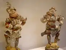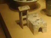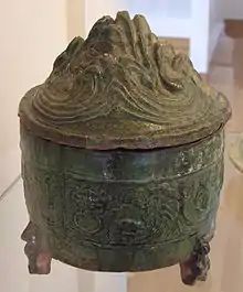 - Керамический треножник: Керамические треножники были характерны для северной части Китая, начиная с неолитической культуры Пэйлиган и до конца династии Шан (1600—1050 до н. э.).[32] Керамические миски и горшки на трёх ножках обнаружены на нескольких стоянках, относящихся к культуре Пэйлиган (7000 — 5000 до н. э.), в том числе на типовой стоянке этой эпохи Цзяху и стоянках Шуйцюань, Шигу и Бэйган. Треножники использовались как сосуды для приготовления пищи, например, с полыми ножками (ли), с плотными ножками (дин), разливочный кувшин (гуй), все они сделаны с тремя ножками и стоят на земле. За пределами материковой части Китая керамические треножники неолитической эпохи были найдены только на Тайване и в континентальной части Юго-Восточной Азии. Находки треножников на стоянке Бан Као подняло вопрос о связи треножников Юго-Восточной Азии с другими аналогичными предметами материковой части Китая. Птицеобразные керамические треножники, найденные, например, в уезде Хуа провинции Шэньси, и гуй середины и конца культуры Давенкоу (3500 — 2600 до н. э.), возможно, были связаны с мифологической трёхногой птицей или золотой вороной.[33] Самые ранние изображения трёхногой птицы найдены на керамике из культуры Майодигоу (4000 — 3000 до н. э.) в провинции Хэнань, они также упоминаются в Хуайнаньцзы и Ши-цзи.