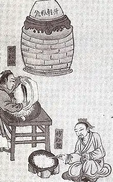 - Веялка: Одновременно с вентилятором для кондиционирования воздуха, изобретённого Дин Хуаном (род. 180 г. н. э.) в эпоху династии Хань (202 BC—220 г. н. э.), была изготовлена керамическая модель вращающегося ветродуйного вентилятора с кривошипным механизмом, используемого в веялке для отделения зерна от мякины.[77][78] Ветродуйный вентилятор впервые описал Ян Шигу (581—645) в эпоху династии Тан (618—907) в своих комментариях к словарю Цзицзиупянь, написанном Ши Ю в 40 г. до н. э. Он был также упомянут примерно в 1060 г. в стихотворении поэта Мэй Яочэня эпохи династии Сун (960—1279).[79] Самый ранний пример веялки со вращающимся вентилятором известен по книге о сельском хозяйстве, опубликованной в 1313 году Ван Чжэнем (1290—1333).[80]