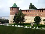 | Нижегородский Кремль | Нижний Новгород | Архитектурный комплекс XVI—XX вв. Стены и башни построены в 1500—1515 гг.[57] итальянцем Петром Фрязином (Пьетро Франческо). | Длина стены — около 2 км. Из 13 башен до нашего времени сохранено 12. | ![]() |