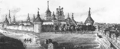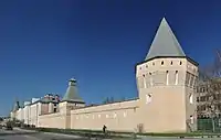 | Высоцкий монастырь | Московская область, Серпухов | Архитектурный комплексXVI — XVII вв. Монастырские стены длиной 510 м[16]. возведены в 1640-е гг. | Большая часть стен и 3 из 5 башен были уничтожены большевиками в 1930-е гг. Сейчас стены восстанавливаются. | ![]() |