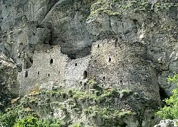 | Дзивгисская пещерная крепость | Республика Северная Осетия - Алания, село Дзивгис | Крепость средних веков (XIII-XVI). | Крепость представляет собой сеть скальных пещер, с фронта защищённых стеной из камня. Кроме того, к входам некоторых естественных пещер над основной стеной также пристроены стены; не исключено, что эти укрепления были связаны с основной частью крепости деревянными лестницами или верёвками. По состоянию на август 2016 г., на основании судебного решения производится демонтаж частных строений, находящихся в охранной зоне крепости. | ![]() |