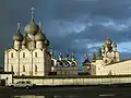 | Ростовский кремль (Митрополичий двор) | Ярославская область, Ростов | Прекрасно сохранившийся архитектурный ансамбль, в основном XVI—XVII вв. Стены и башни построены в 1670—1683 гг[26] ростовским митрополитом митрополитом Ионой Сысоевичем. | К «кремлевскому» двору с двух сторон присоединены участки слабых каменных ограждений. Стены же собственно «кремля» имеют 7 высоких башен и две надвратные церкви крепости. | ![]() |