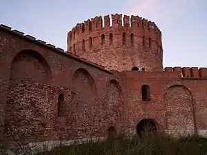 | Смоленская крепость | Смоленск | Огромная крепость с длиной стен 6,5 км и с 38 башнями построена в 1596—1602 гг[30]. мастером Ф. С. Конь. | Постепенно разбиралась в XVIII—XX вв. До нашего времени дошли большие фрагменты стены с 17 башнями. | ![]() |