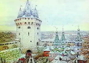 | Рубленый город ("Рубленый город ") | Ярославль | Каменные стены кремля с 16 башнями построены в 1640-е — 1670-е гг. | Кремль почти полностью уничтожен в конце XVIII в., до наших времён остались лишь 2 одиночные башни — Волжская и Власьевская (Знаменская)[24]. Остатки кремля — в числе городских достопримечательностей ЮНЕСКО. | ![]() |