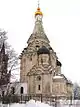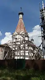 | Воскресенский собор Новоиерусалимского монастыря | Московская область, Истра | 1658 - 1666, кирпичный шатер 1682 - 1684. | Выстроен мастером Аверкием Мокеевым по заказу патриарха Никона, достраивался при царе Фёдоре III. Шатровая часть не являлась церковью, представляя собой "двор церковный под великим шатром" вокруг часовни Гроба Господня. Шатёр обрушился в 1723. Отстроен И.Ф.Мичуриным в 1732 - 1738 (верхний ярус с шатром воссоздан из дерева в 1756 - 1761 под смотрением К.И.Бланка, по проекту Ф.-Б. Растрелли (1754)). Храм разрушен немецкими оккупантами в 1941, вчерне восстановлен к 1994. | ![]() |