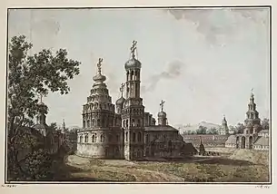 | Церковь Сергия Радонежского Богоявленского Троице-Сергиева монастыря в Кремле. | Москва | 1557. | Двухъярусный, трехапсидный храм, завершавшийся высоким шатром, украшенным поливными изразцами. Храм и другие монастырские постройки снесён при работах по реконструкции Кремля Баженовым в 1770 году. | |