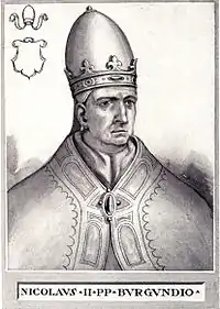 Папа Николай II, епископ Флорентийский Жерар де Шеврон, не был кардиналом, когда был избран Папой в декабре 1058 года. На Латеранском синоде 13 апреля 1059 года он обнародовал декрет «In nomine Domini», который дал кардиналам-епископам исключительное право избирать римского понтифика. Затем должны были быть приведены другие кардиналы, а остальное духовенство и народ должны были дать своё согласие на избрание. Было смутное упоминание о праве императора утверждать избрание, которое должно было быть предоставлено каждому преемнику, и которое могло быть потеряно, если его неправильно использовать. С тех пор кардиналы были вторыми в иерархии Церкви, уступая только Папе. Николай II умер 27 июля 1061 года.