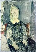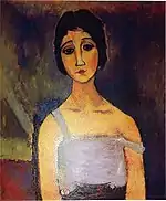 | Портрет женщины фр. Buste de femme | ![]() | 1907 | Холст, масло | 46,1 x 33,2 | Ceroni 4, Lanthemann 11, J. Modigliani да, Patani 8 | частная коллекция, 24 июня 2010 года продана на аукционе «Кристис» за £409 250 | [33][34] |