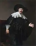 Портрет мужчины, возможно, из семьи Ван Берестейн | 1632 | Холст, масло | 112.5 x 88.8 | 63b | Рембрандт и (большей частью) мастерская. Парный к 63a. Левая рука, изначально занимавшая более низкую позицию, и стол, на котором она лежит, вероятно, выполнены самим Рембрандтом | |