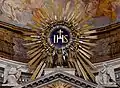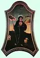 - IHS (IHC, JHS, YHS) — монограмма имени Христова, эмблема ордена иезуитов. На дощечке в окружении языков пламени — атрибут Бернардина Сиенского, написанная на сердце — Ансана.