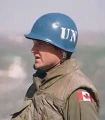 Одним из символов миротворческой деятельности является голубая каска (канадский миротворец, 1976 год)