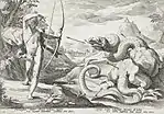 Пифон | Сын Геи либо Геры. | Змей, охранявший вход в Дельфийское прорицалище до занятия его Аполлоном. Девятью кольцами обвил выси Парнаса, или семь раз обвил Дельфы. Убивая его, Аполлон выпустил либо 100 стрел, либо 1000 стрел. |
