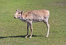Сайгак (Saiga tatarica (Linnaeus, 1766)) | Cайгаки обитают только в Казахстане, Узбекистане, Киргизии, с заходами в Туркмению, в России и западной Монголии. Реинтродуцирована на Украине в заповеднике Аскания-Нова. | 1(CR). Внесён в Красный список МСОП [CR A2acd], {CR A2acd}. | [6][7] |