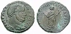 Действовал с периода правления Диоклетиана до времени правления Зенона как монетный двор восточного диоцеза[18]. Восстановлен Анастасием I. Переименован в Теополисский (греч. Θεούπολις, Город Бога) после землетрясения 526 года[19]. После 610 года, очевидно, функции антиохийского двора перешли к иерусалимскому[20] | ![]() Констанций I Хлор. Аргентиус, ок. 295 г. |