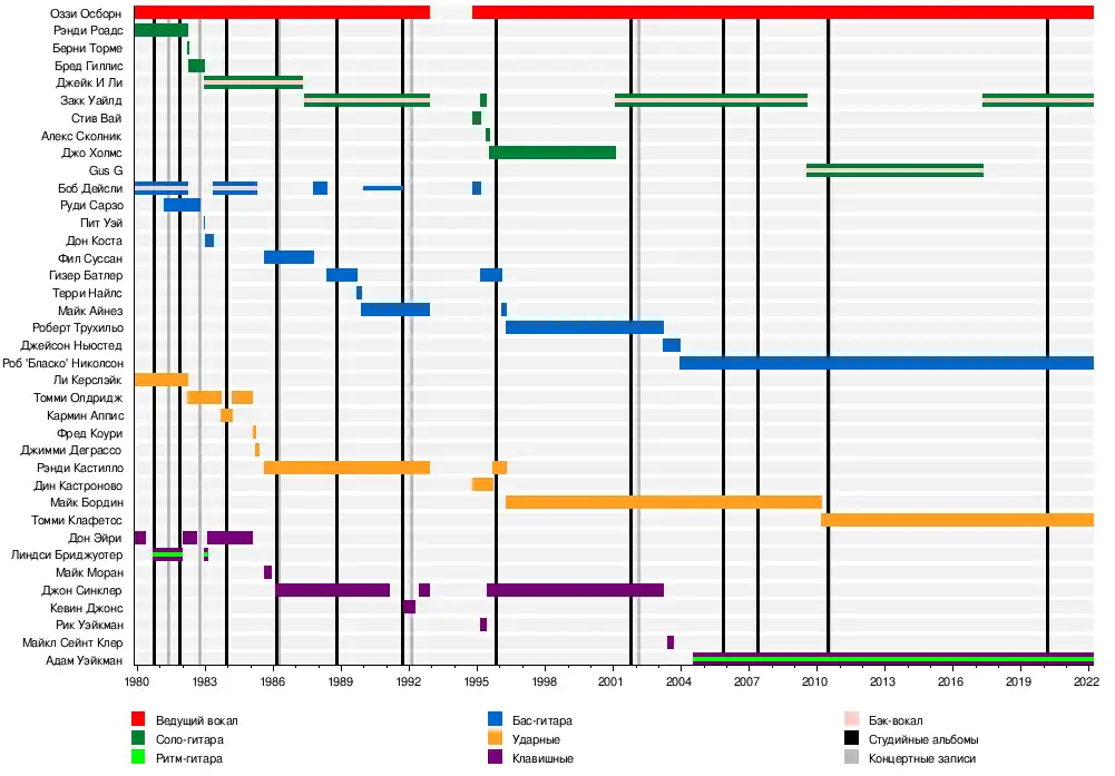 | Оззи Осборн | 1979-настоящее | ведущий вокал | все релизы Ozzy Osbourne | |